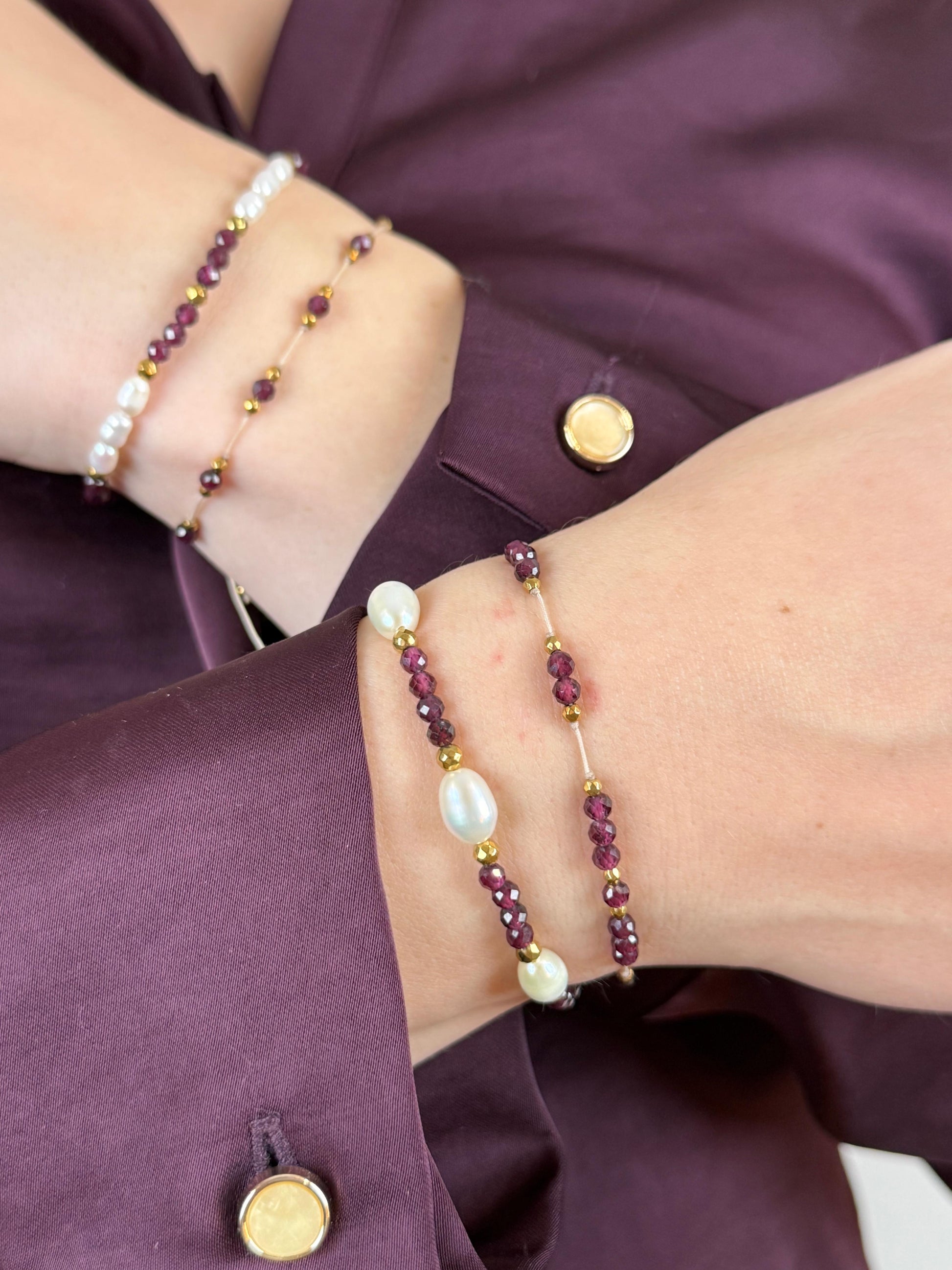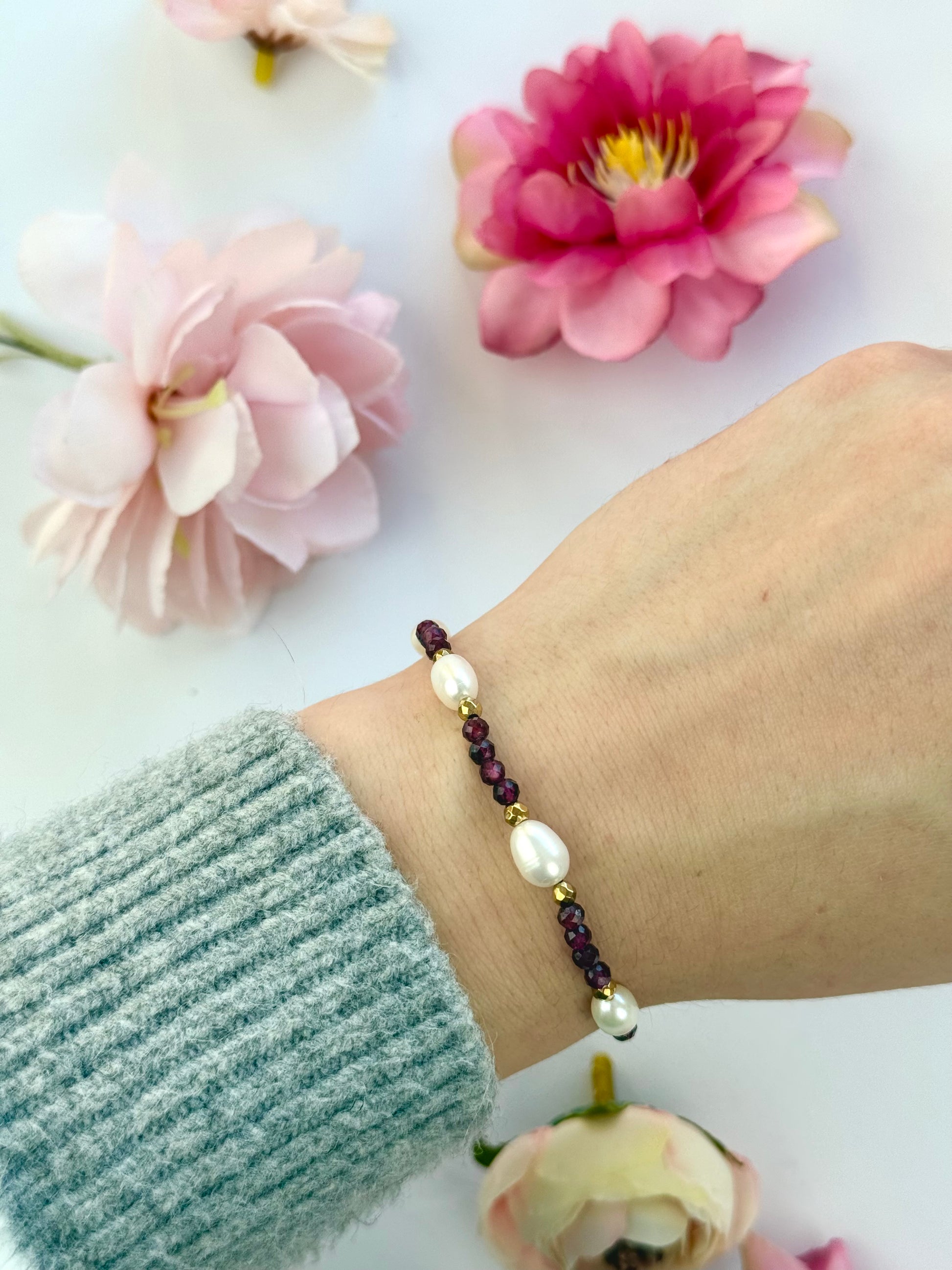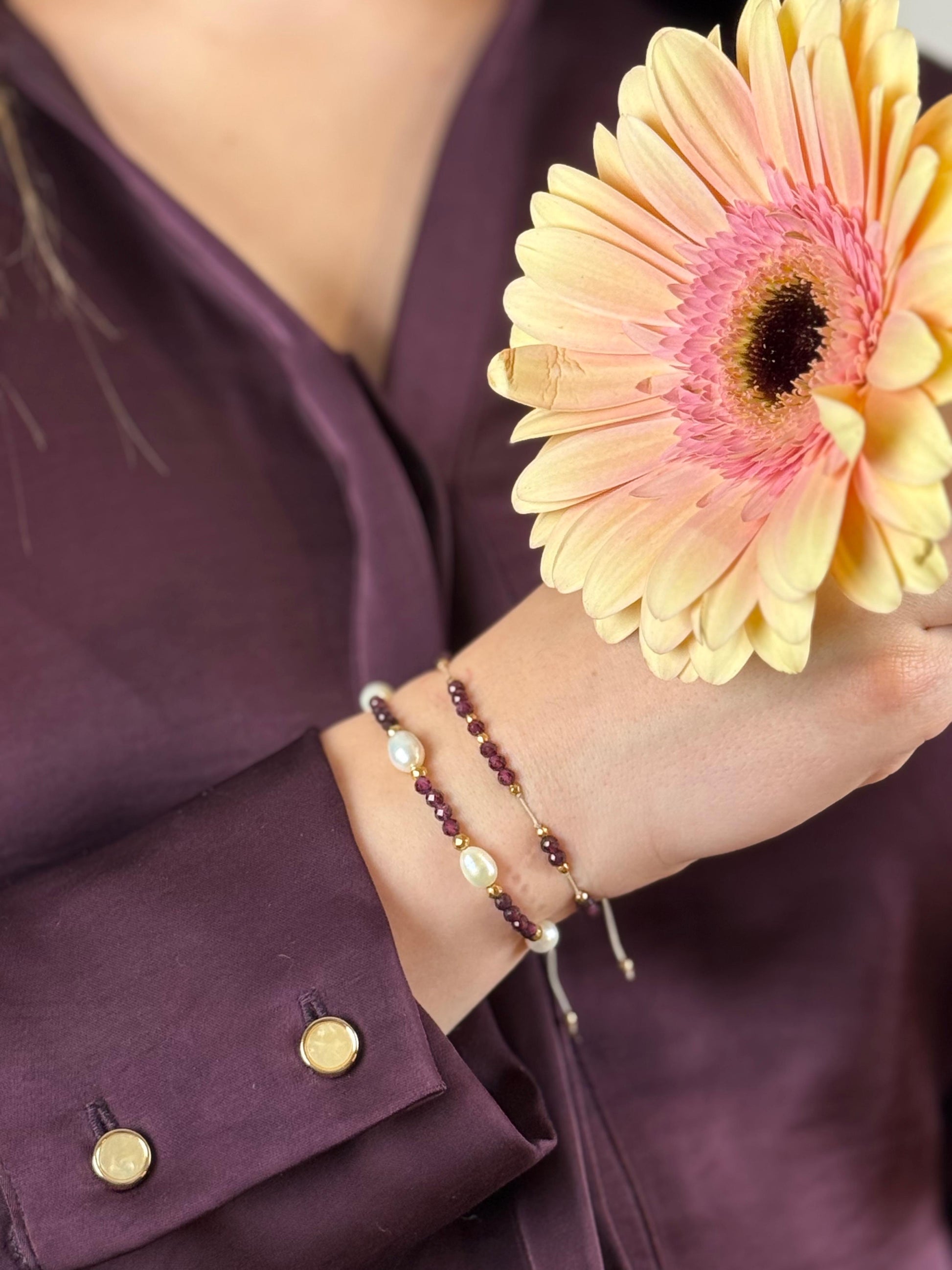 IRIS – Granat to ręcznie tworzona bransoletka z naturalnych kamieni, zaprojektowana z myślą o kobiecej sile i zmysłowej elegancji.
