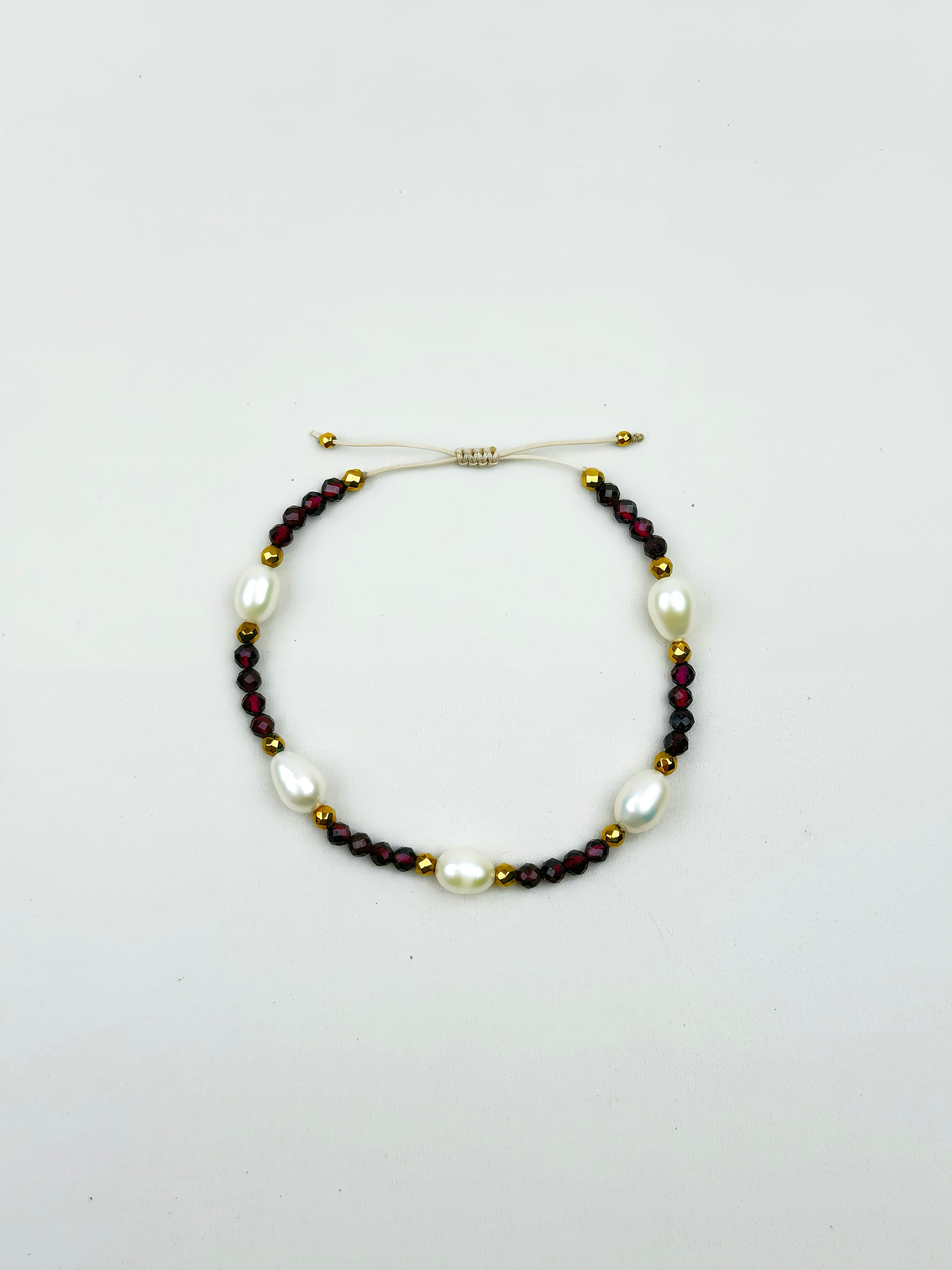 Połączenie granatu, naturalnej perły oraz złotego hematytu tworzy wyrazistą, a jednocześnie harmonijną kompozycję. Głęboki odcień granatu pięknie kontrastuje z miękkim blaskiem perły, nadając biżuterii luksusowy i ponadczasowy charakter.