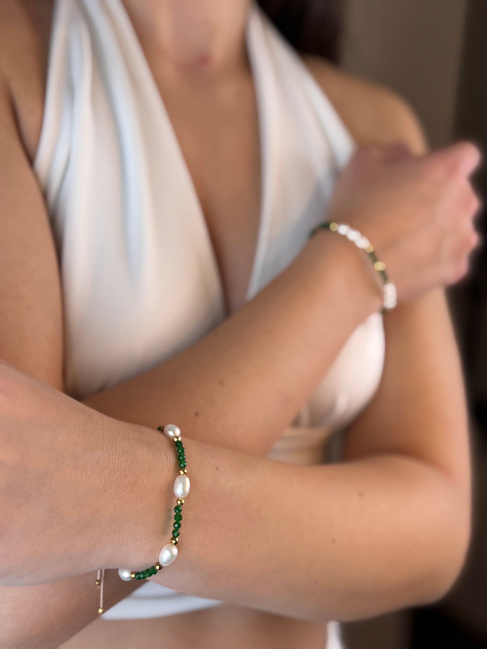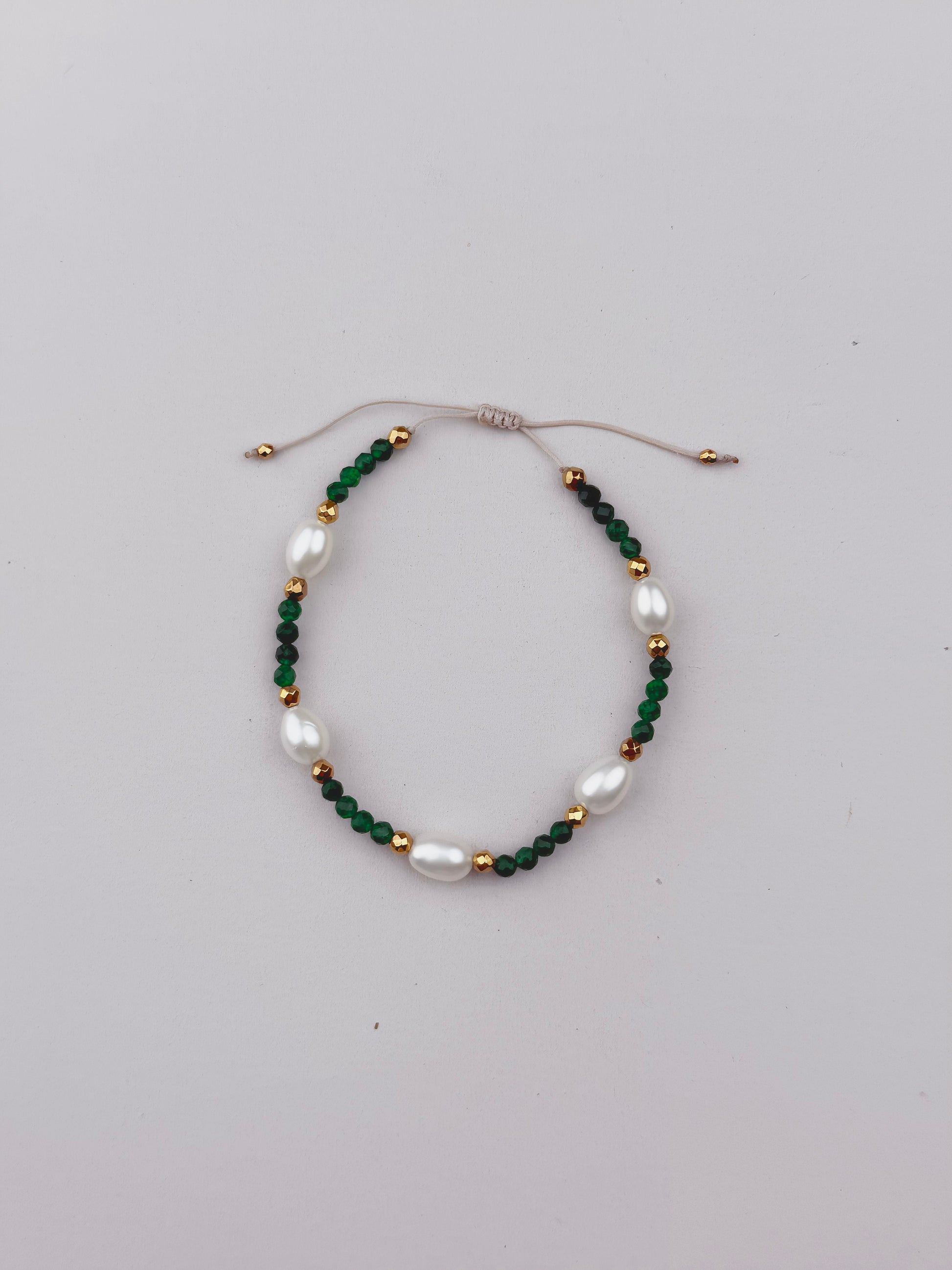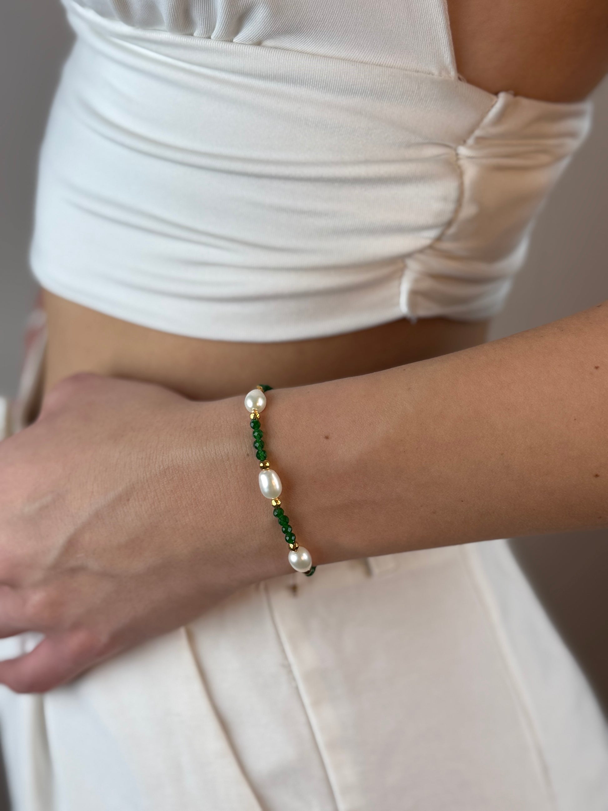 Połączenie jadeitu butelkowego, naturalnej perły oraz złotego hematytu tworzy kompozycję w odcieniach ciemnej zieleni i złota. To biżuteria niezwykle szlachetna, subtelna i ponadczasowa.