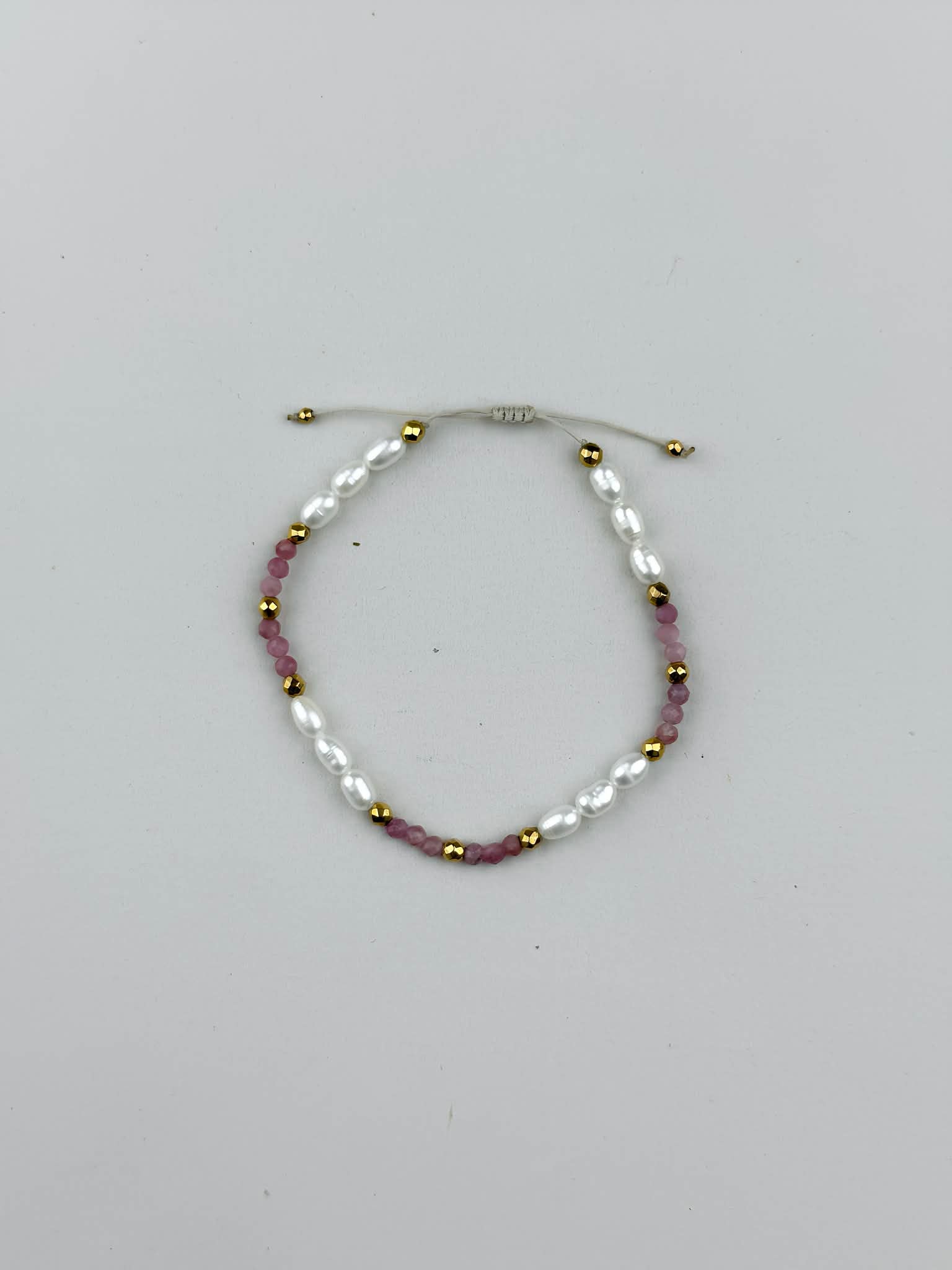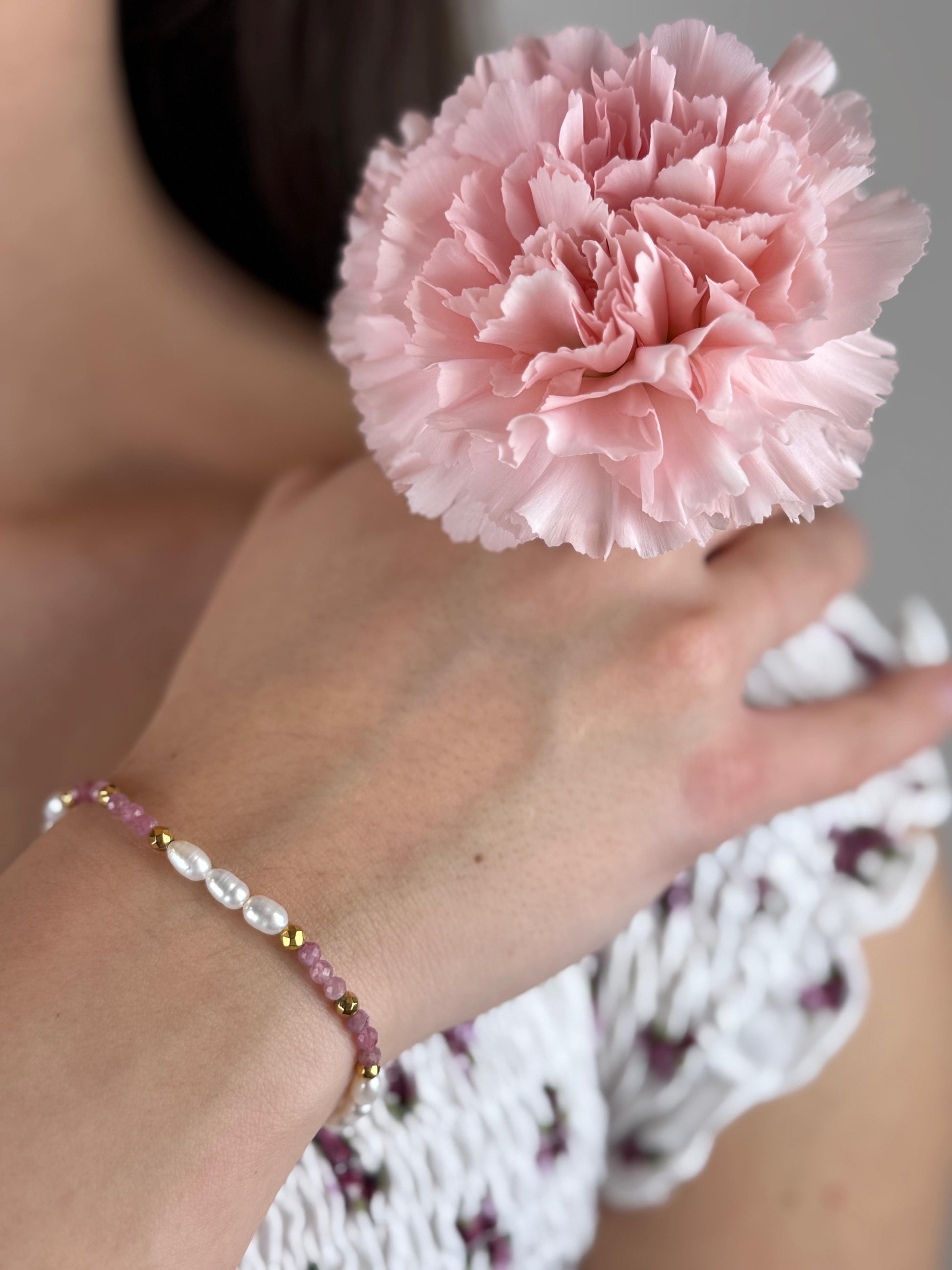 Połączenie subtelnego różu z delikatnymi perłami tworzy harmonijną i zmysłową kompozycję. Złoty hematyt dodaje całości elegancji i podkreśla luksusowy charakter biżuterii. Każda bransoletka powstaje ręcznie, z dbałością o detal i intencję.
