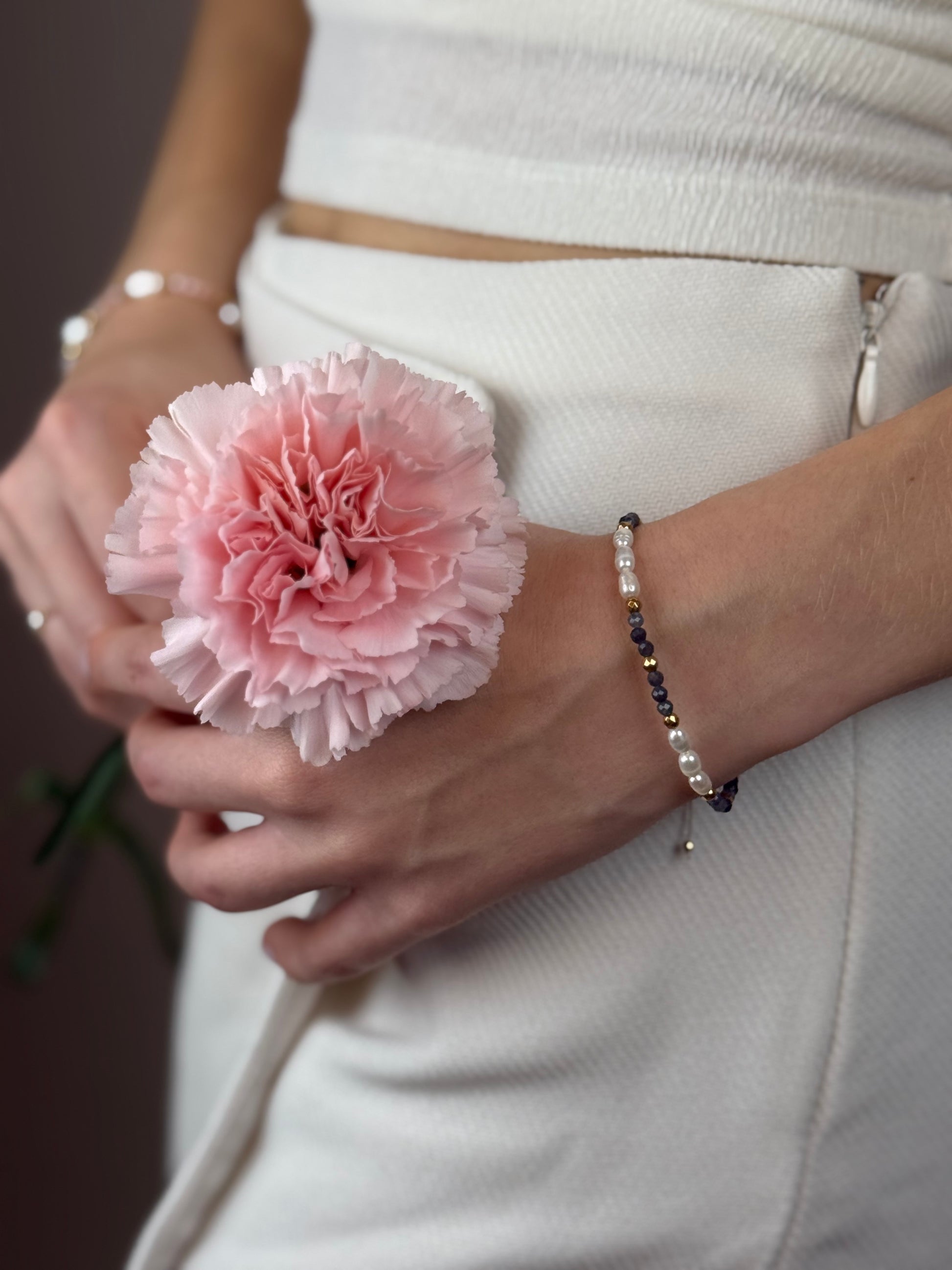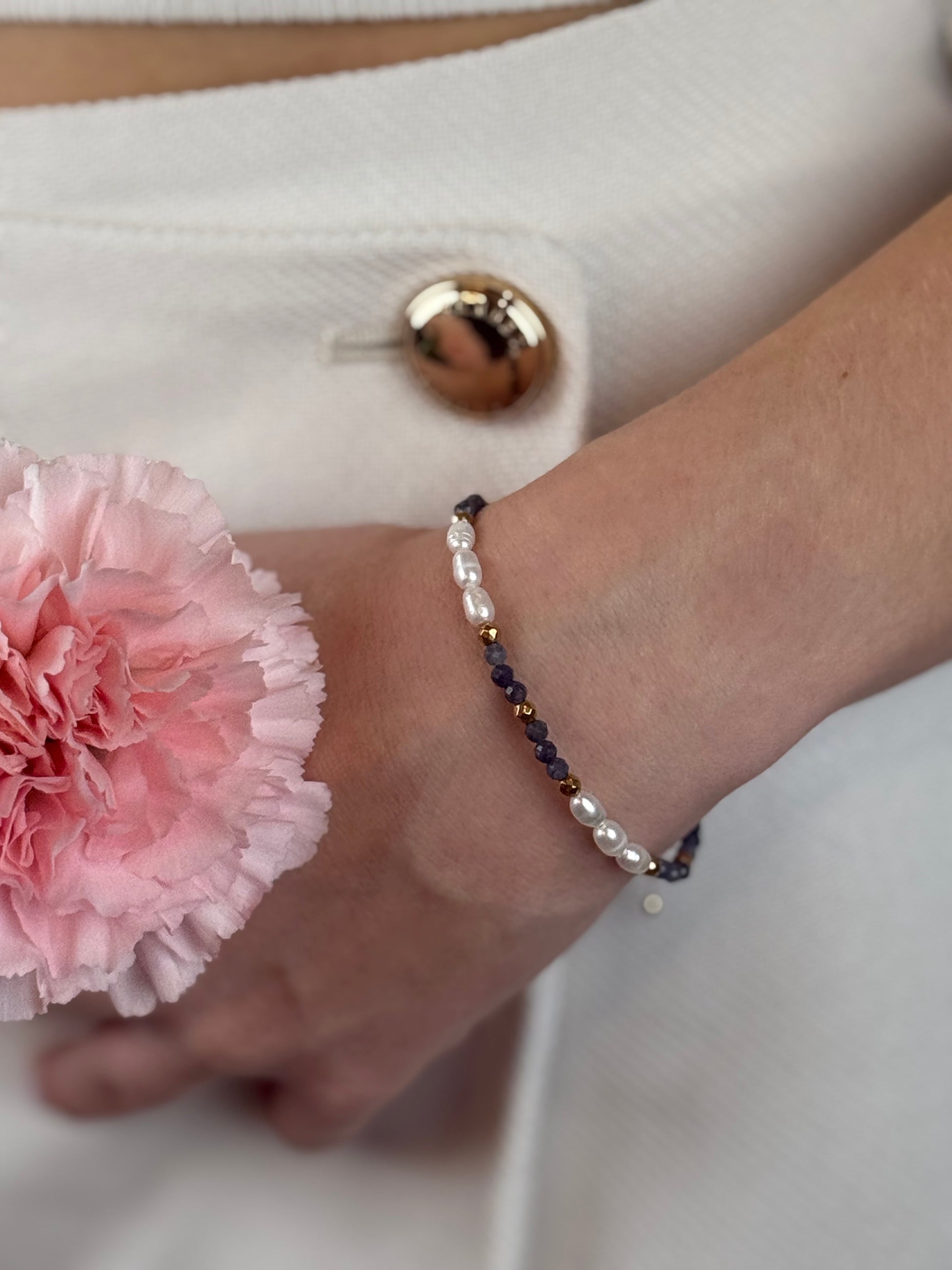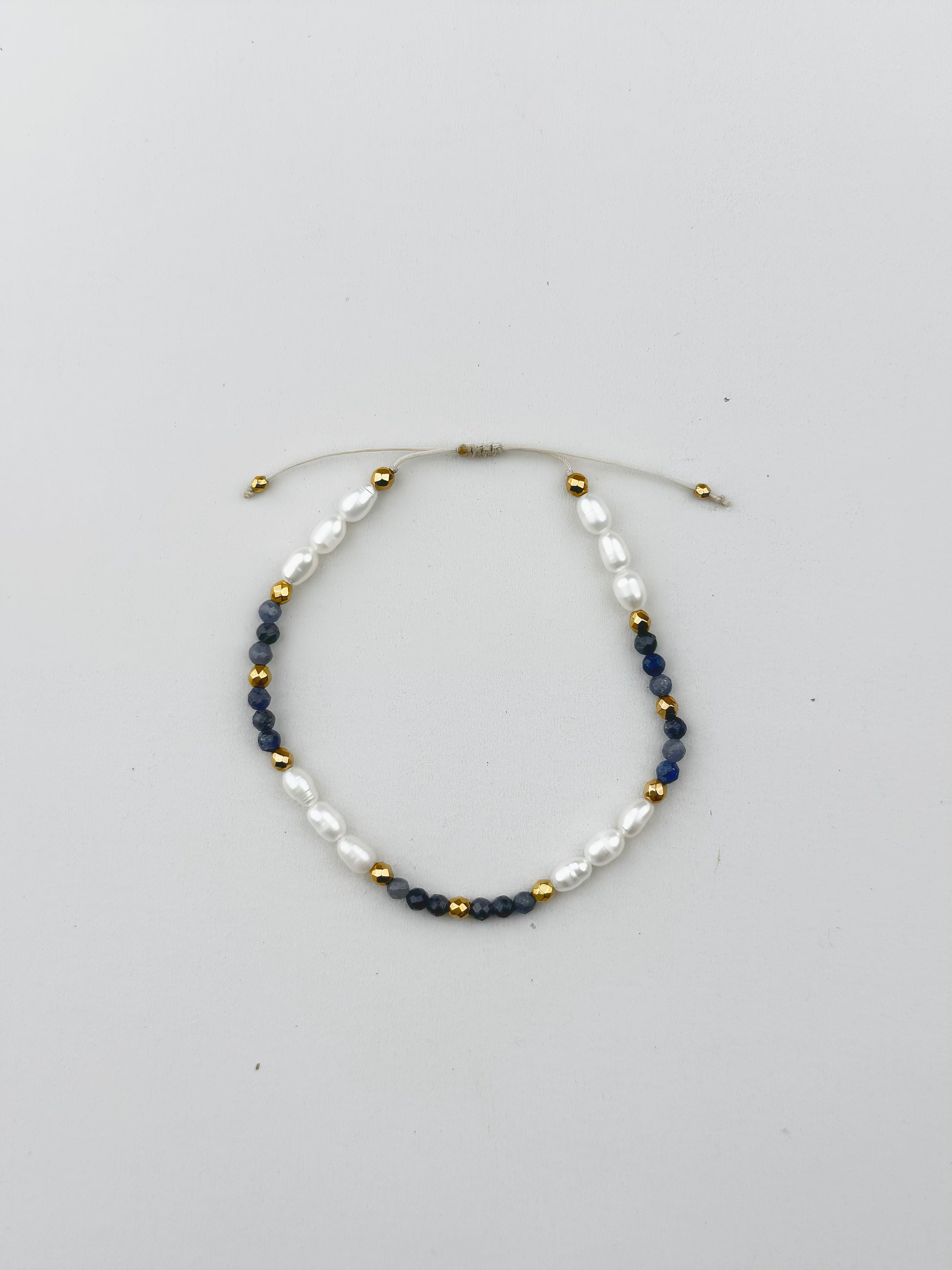 LUNA – Szafir to ręcznie tworzona bransoletka z naturalnych pereł, szafiru i złotego hematytu, zaprojektowana z myślą o klarowności i wewnętrznej sile.