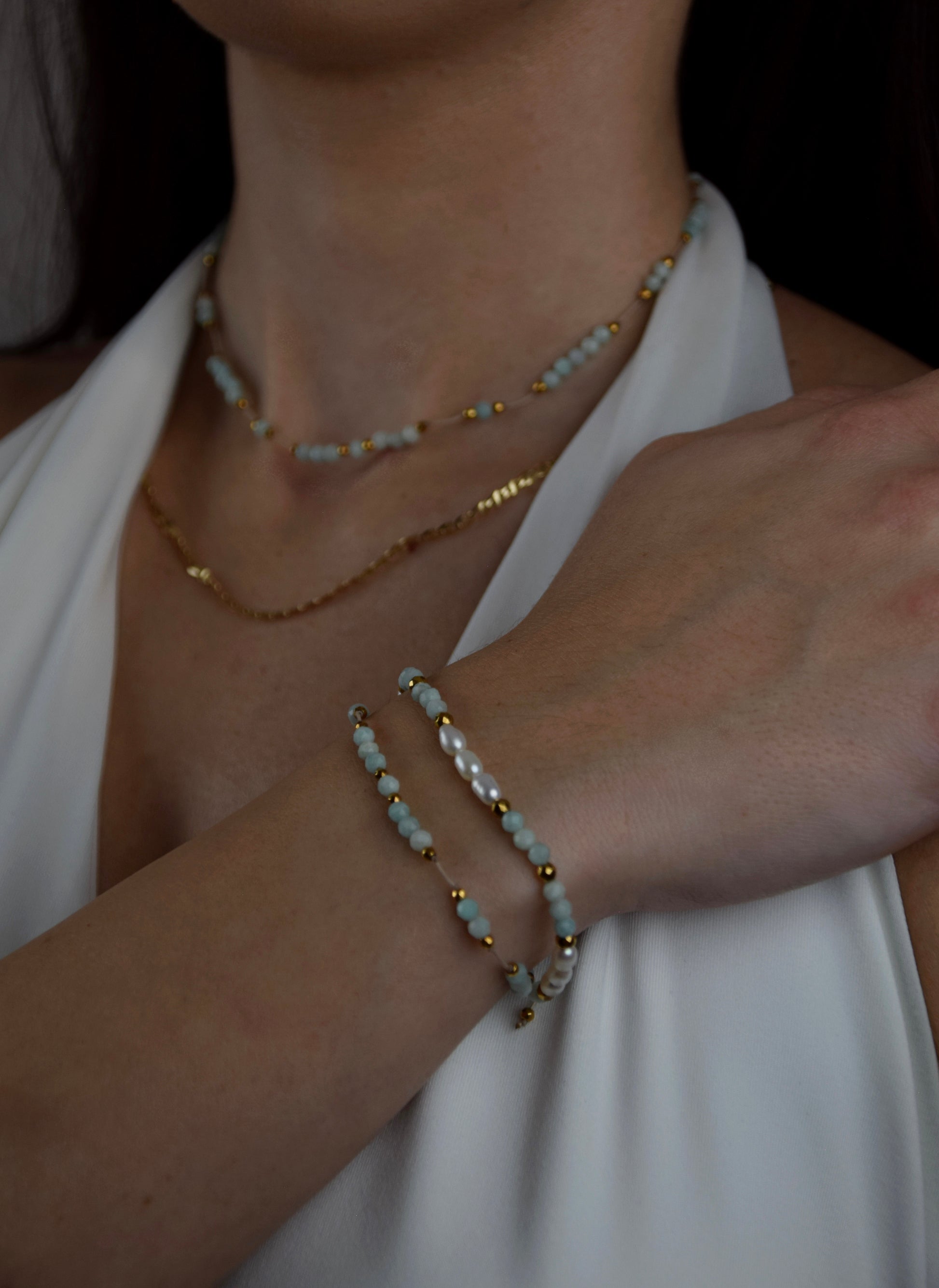 Pastelowy odcień amazonitu wprowadza świeżość i subtelność, a perły dodają klasycznej elegancji. Całość tworzy lekką, kobiecą formę idealną do codziennego noszenia.