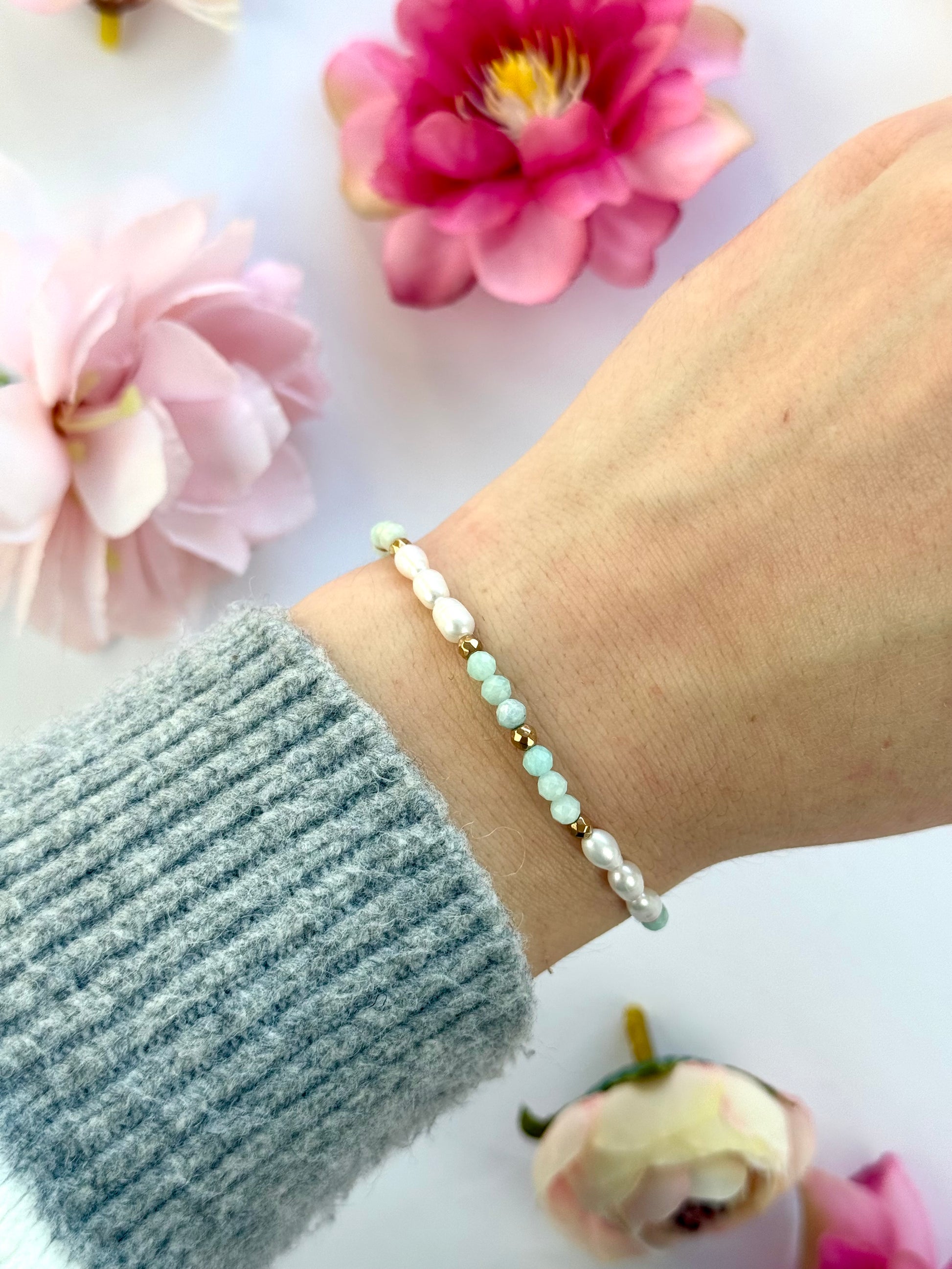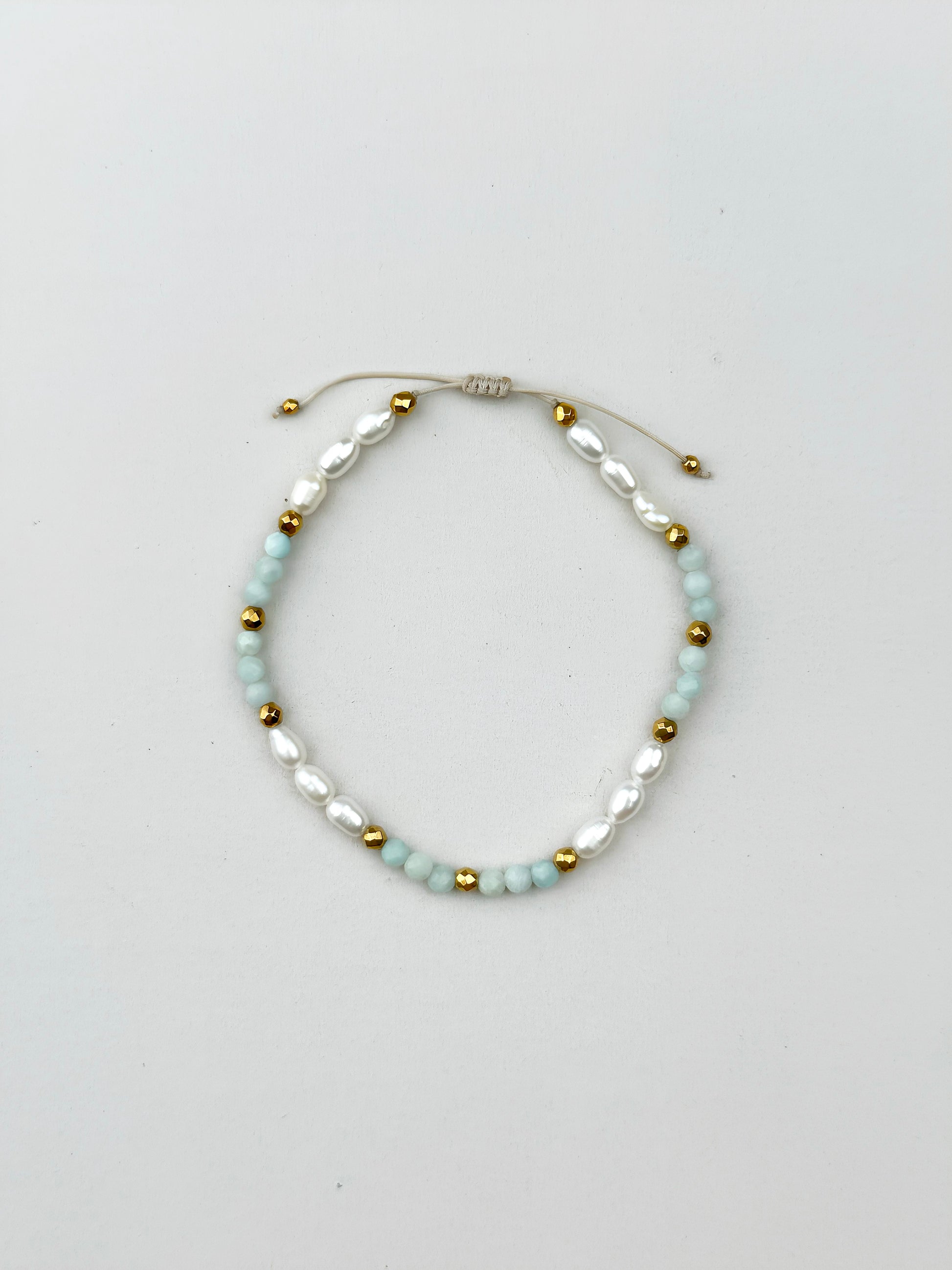 LUNA Amazonit to delikatna, ręcznie tworzona bransoletka z naturalnych pereł, amazonitu i złotego hematytu, stworzona z myślą o harmonii i lekkości.