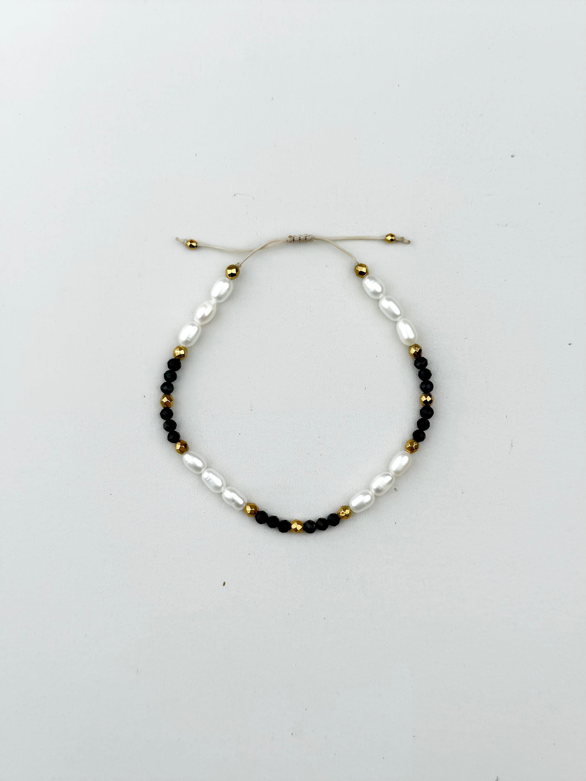 Głęboka czerń turmalinu w połączeniu z perłami i złotym hematytem tworzy elegancki kontrast, który nadaje biżuterii minimalistyczny, luksusowy charakter.