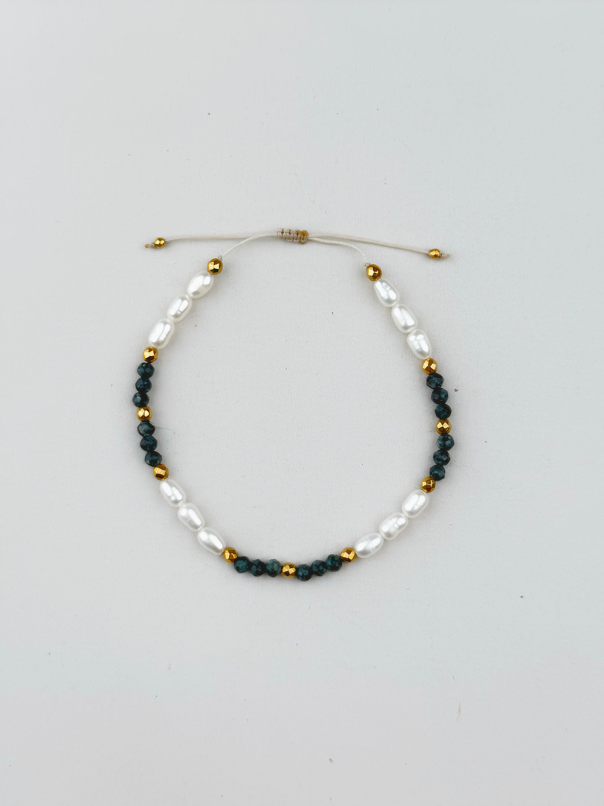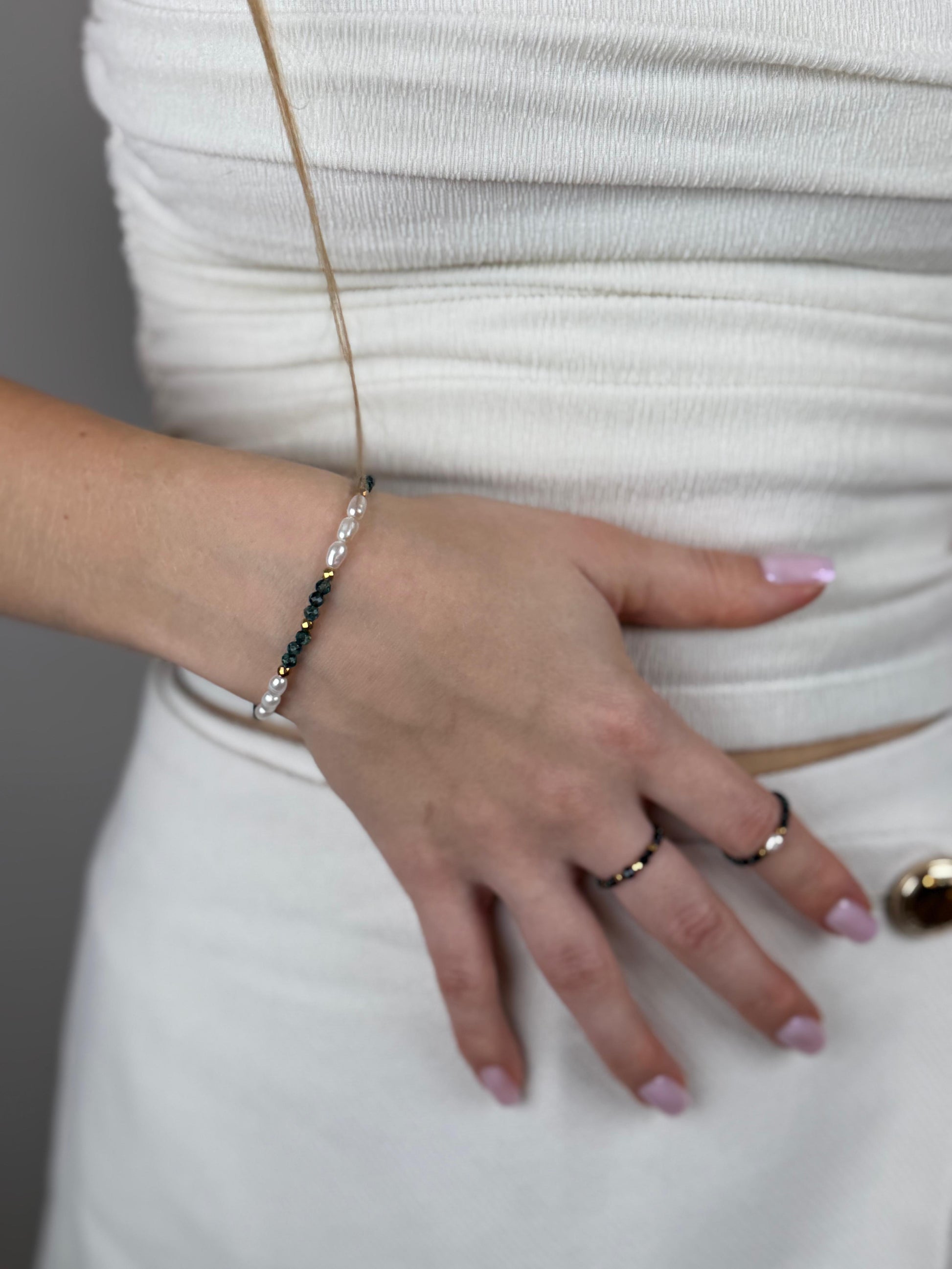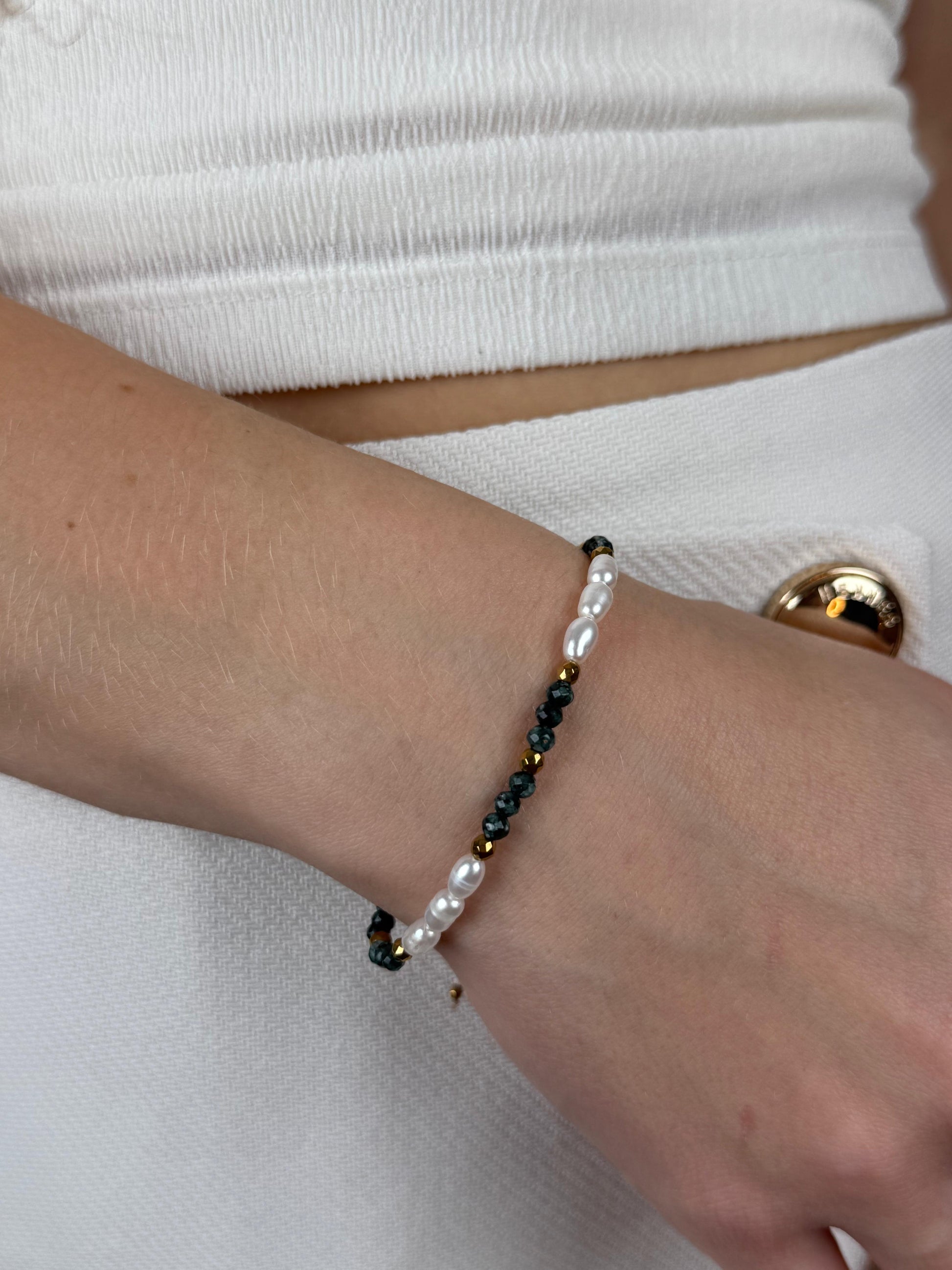 Połączenie jaspisu, naturalnych pereł i złotego hematytu tworzy zrównoważoną, spokojną kompozycję, idealną dla kobiet ceniących harmonię i naturalność.