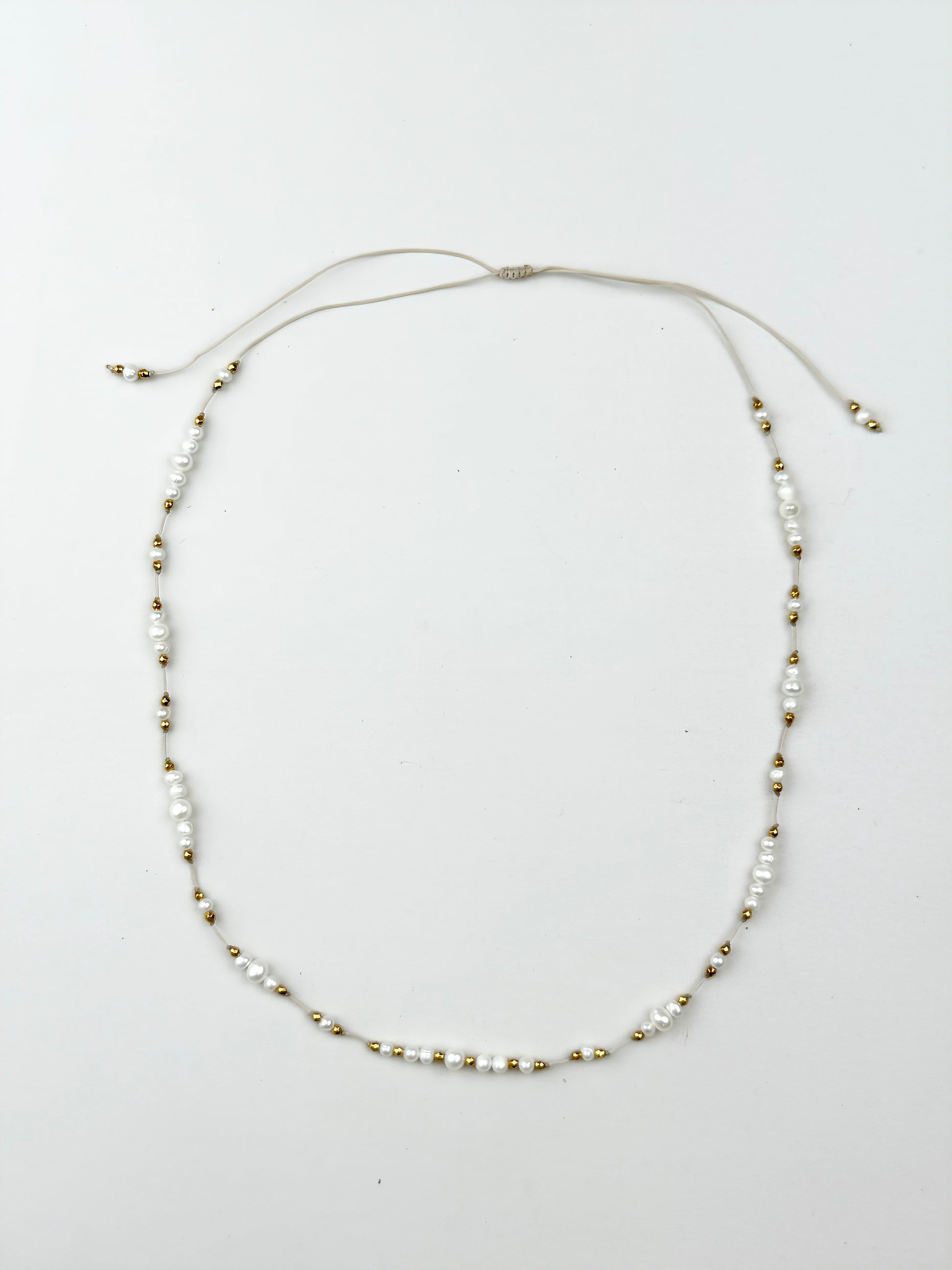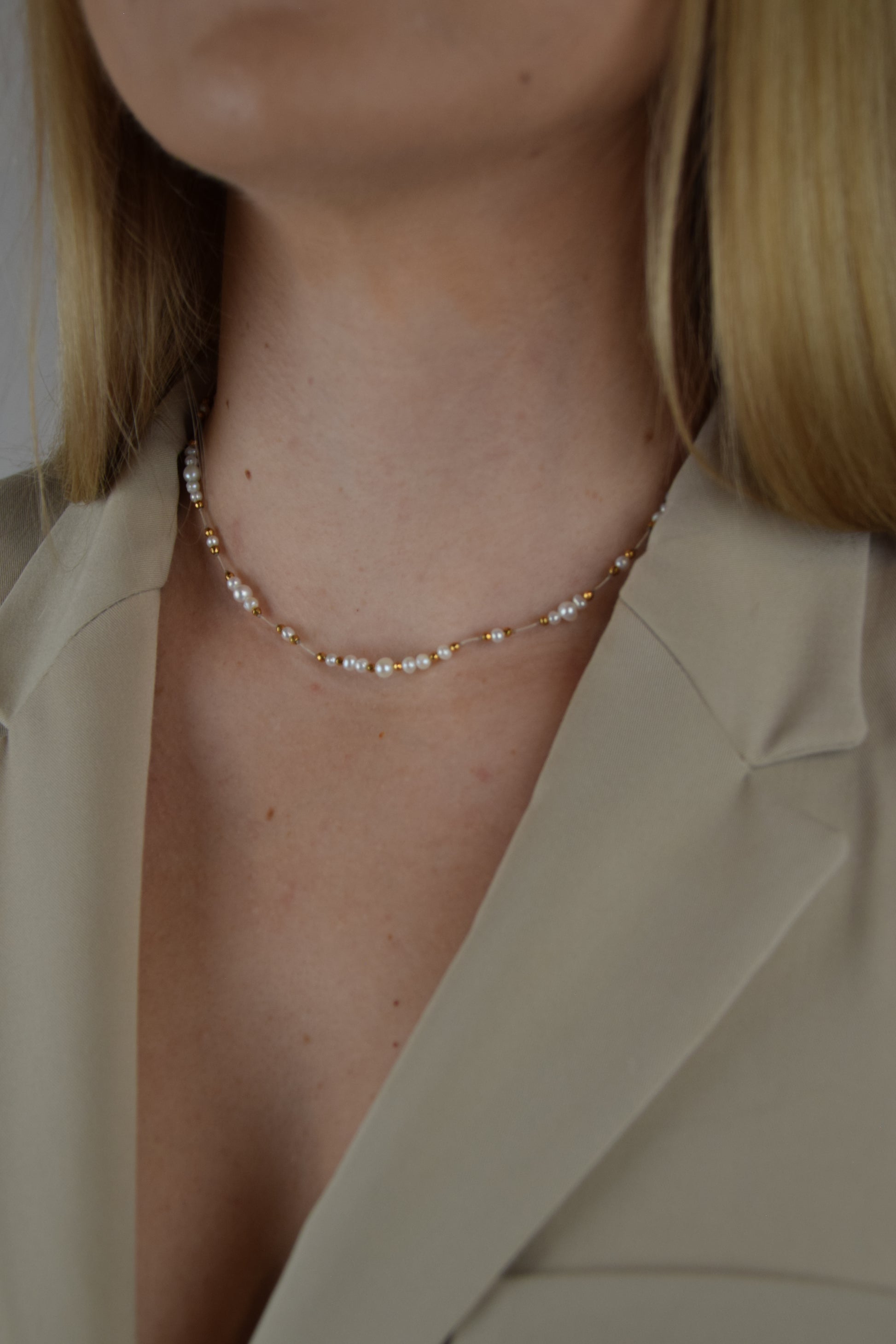 AURORA to ręcznie tworzony naszyjnik z naturalnych pereł i złotego hematytu, inspirowany światłem, delikatnością i kobiecą elegancją.